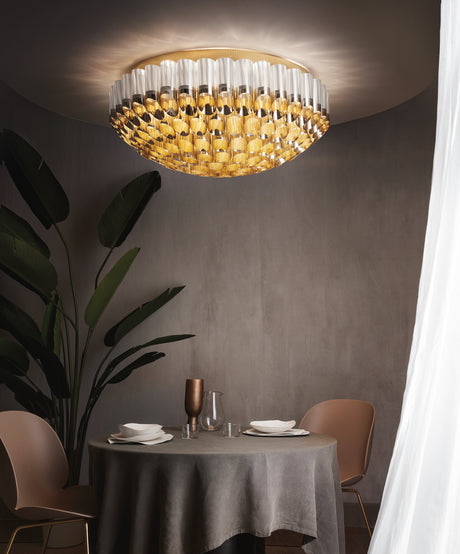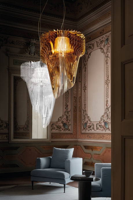 1. Salon i jadalnia: żyrandole, lampy wiszące i sufitowe, które będą głównym źródłem światła i podkreślą wyjątkowy charakter przestrzeni.