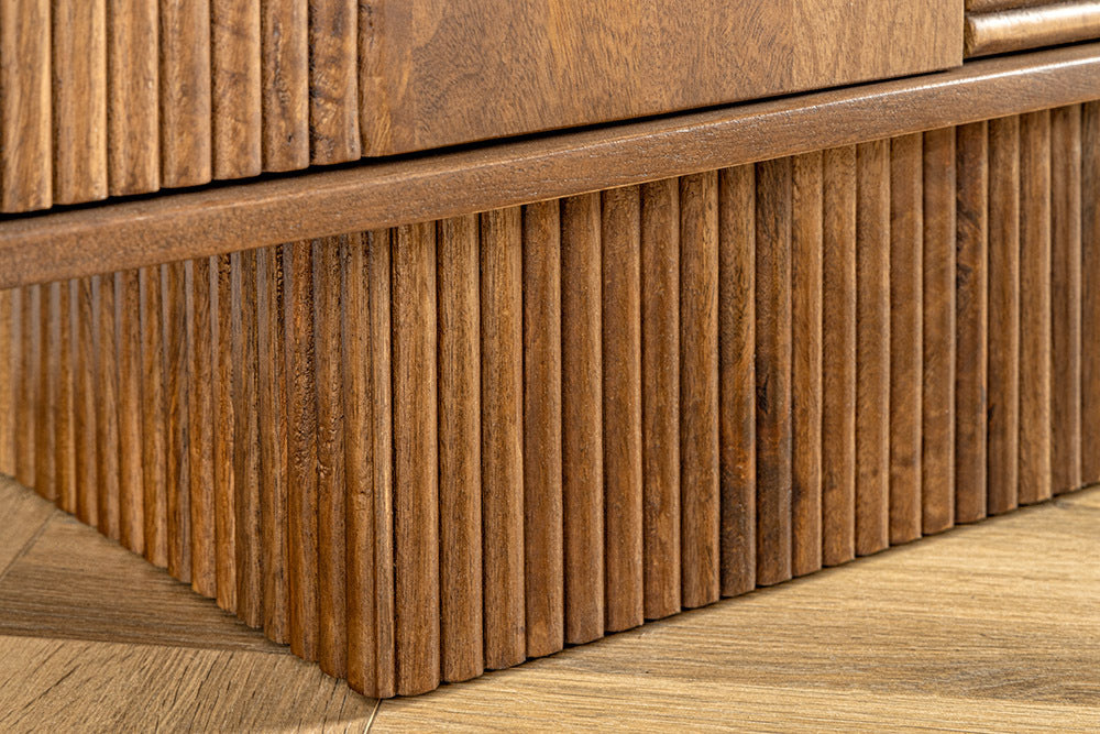Ta wyjątkowa komoda z litego drewna mango to idealne połączenie funkcjonalności, elegancji i nowoczesnego designu. Jej fronty zdobią efektowne frezowane wzory 3D o geometrycznym charakterze, które pięknie załamują światło i nadają meblowi artystycznego wyrazu. Każdy egzemplarz jest niepowtarzalny dzięki naturalnemu usłojeniu drewna mango, które wprowadza do wnętrza ciepło i autentyczność.