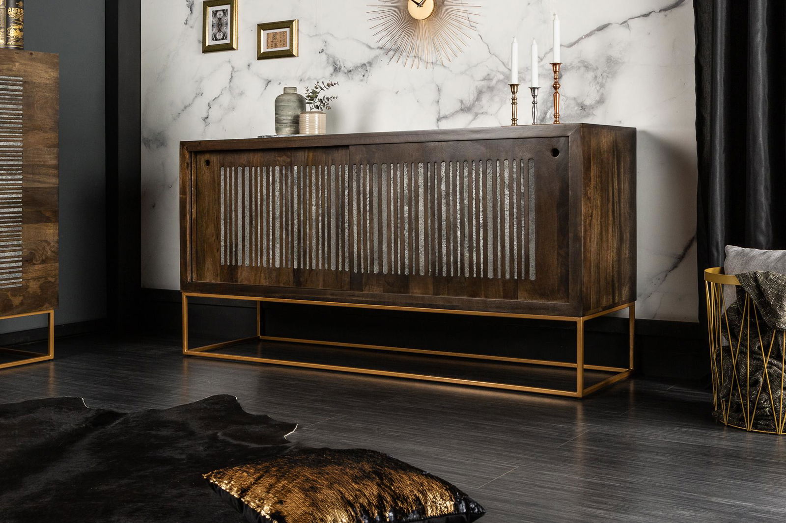Nowoczesna komoda ONGX o bardzo designerskim oryginalnym wzornictwie zapiera dech dzięki wyjątkowemu stylowi. Przepiękna komoda ONGX stanowi harmonijną i szlachetną symbiozę trzech materiałów, które razem tworzą niepowtarzalny design. Na matowej, stabilnej i złoconej ramie został zaprojektowany masywny korpus z drewna mango. Na szczególny aplauz w świecie designu bez wątpienia zasługuje połączenie drewna, metalu oraz kamienne zdobienie drzwi mające postać licznych pasów forniru skalnego, uszlachetnionego drobnymi elementami z kamienia Agat. Z jednej strony natura w całej okazałości, z drugiej luksusowy design. Niebywale, że jest to kolekcja wykonana ręcznie.