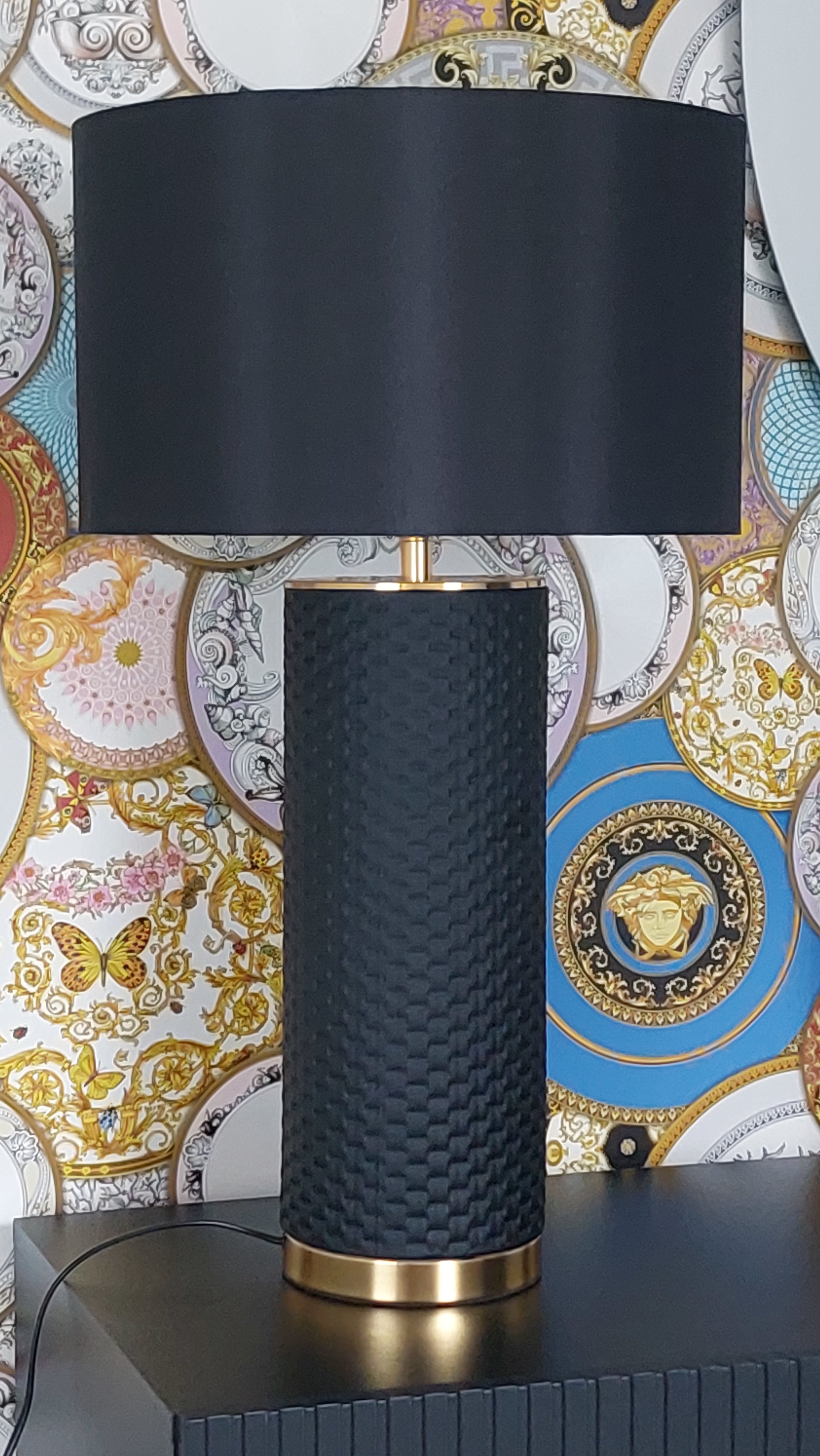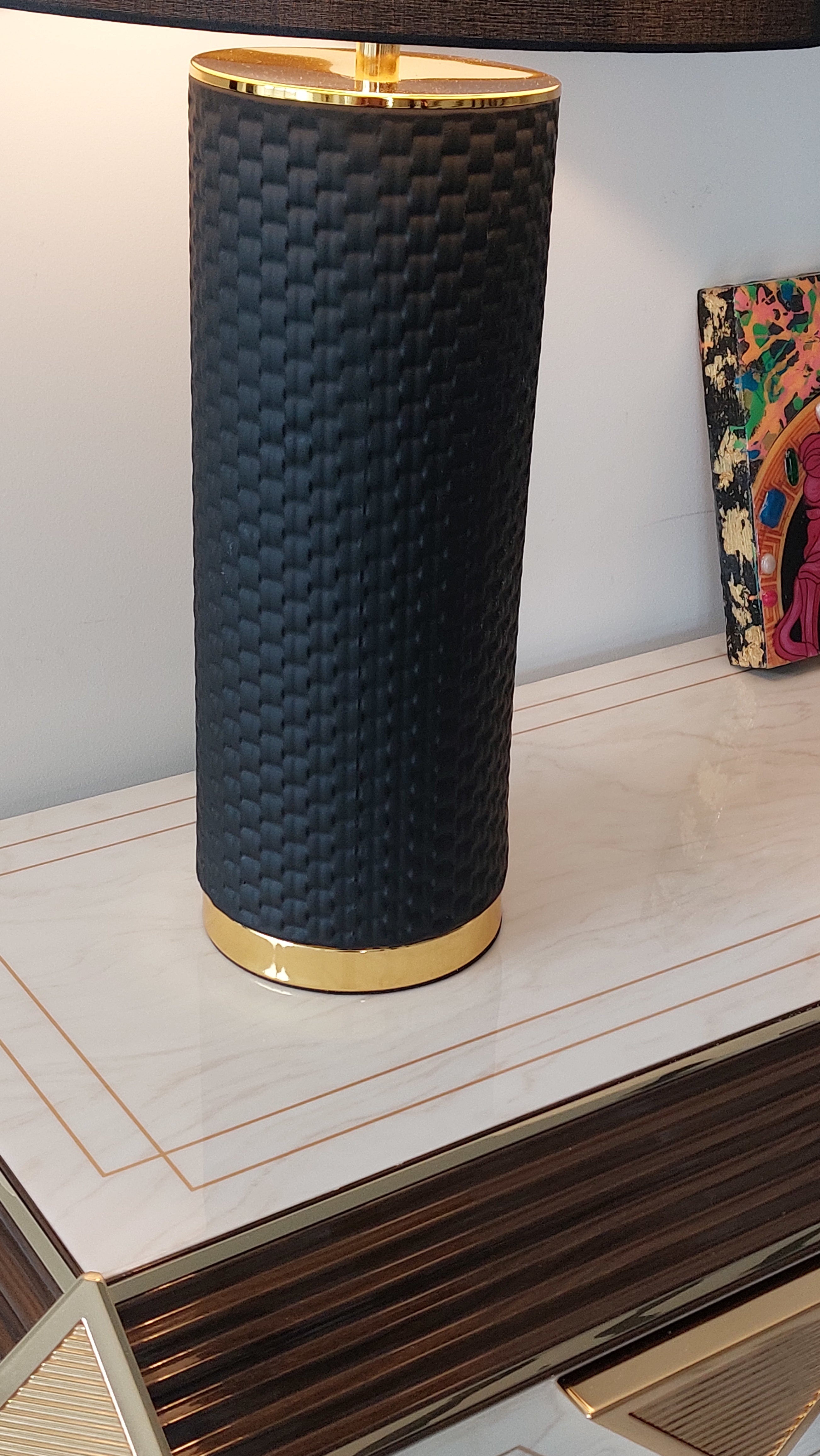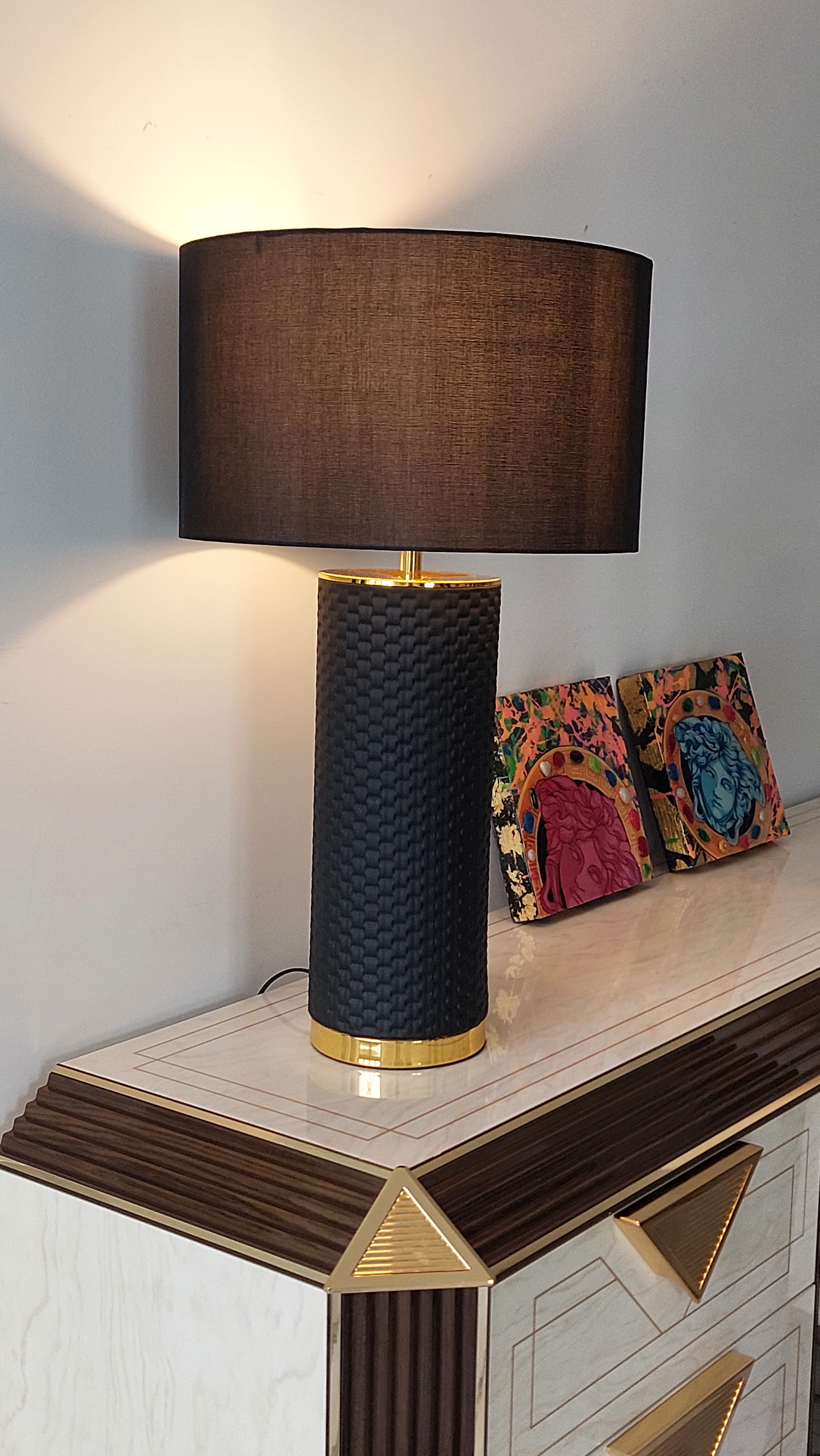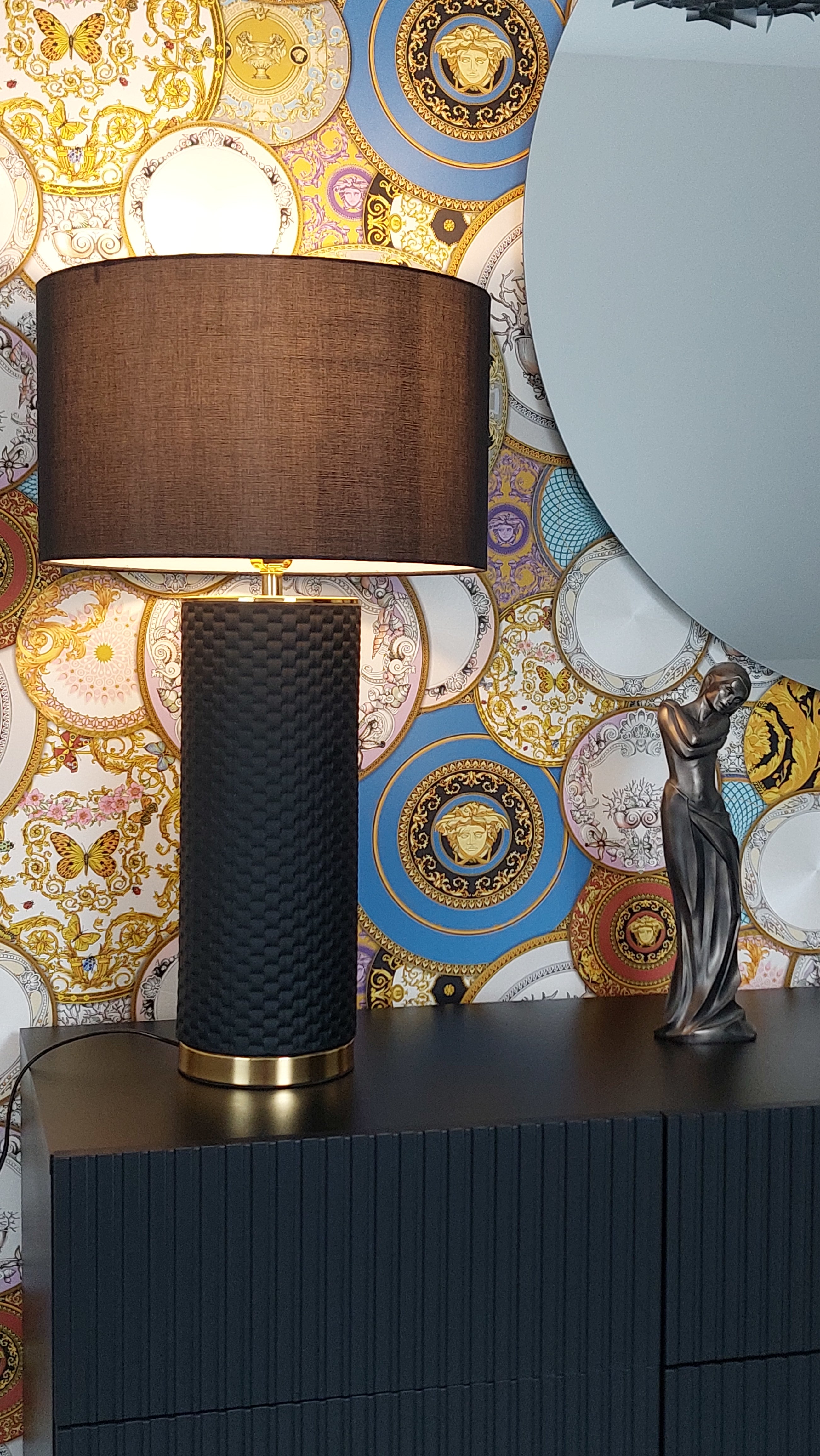 Piękna okazała lampa stołowa ELEGANCIA o eleganckim designie posiada okrągłą, artystycznie wypalaną ceramiczną podstawę w kolorze czarno-złotym o luksusowym wyglądzie, zapewniającą stabilność. Okrągły klosz z czarnego materiału rozprasza światło, tworząc przyjemną atmosferę – idealną na przytulne wieczory. Lampę można postawić na stolik pomocnicze, szafki nocne lub komody. Połączenie czerni i złota harmonijnie komponuje się z różnymi stylami wystroju wnętrz.
