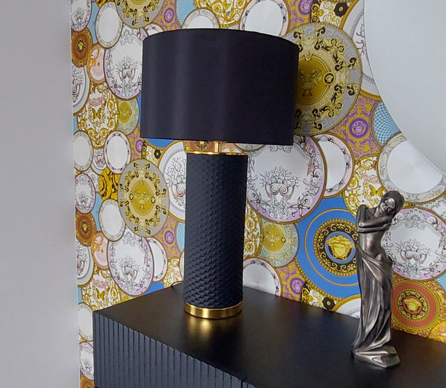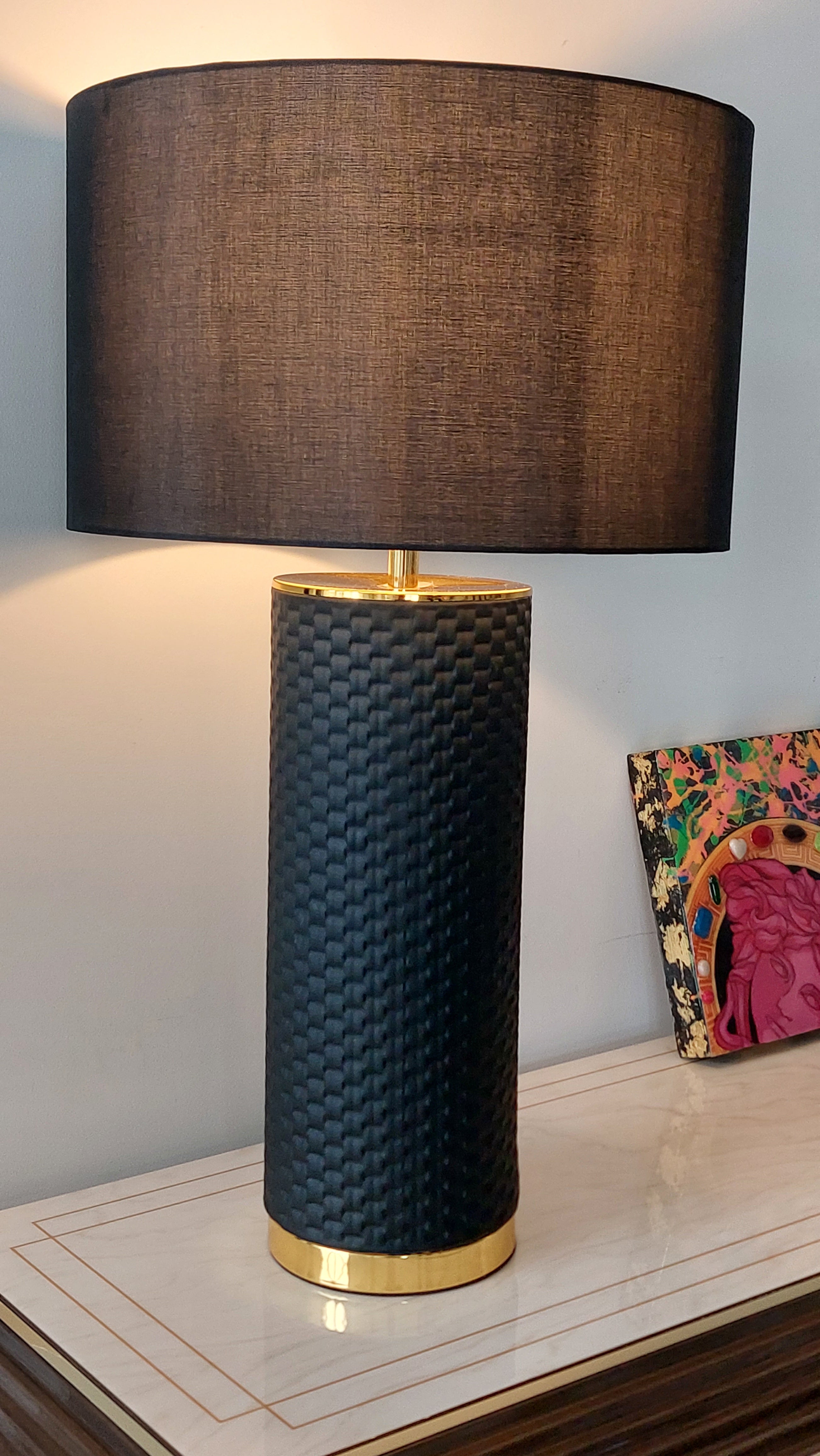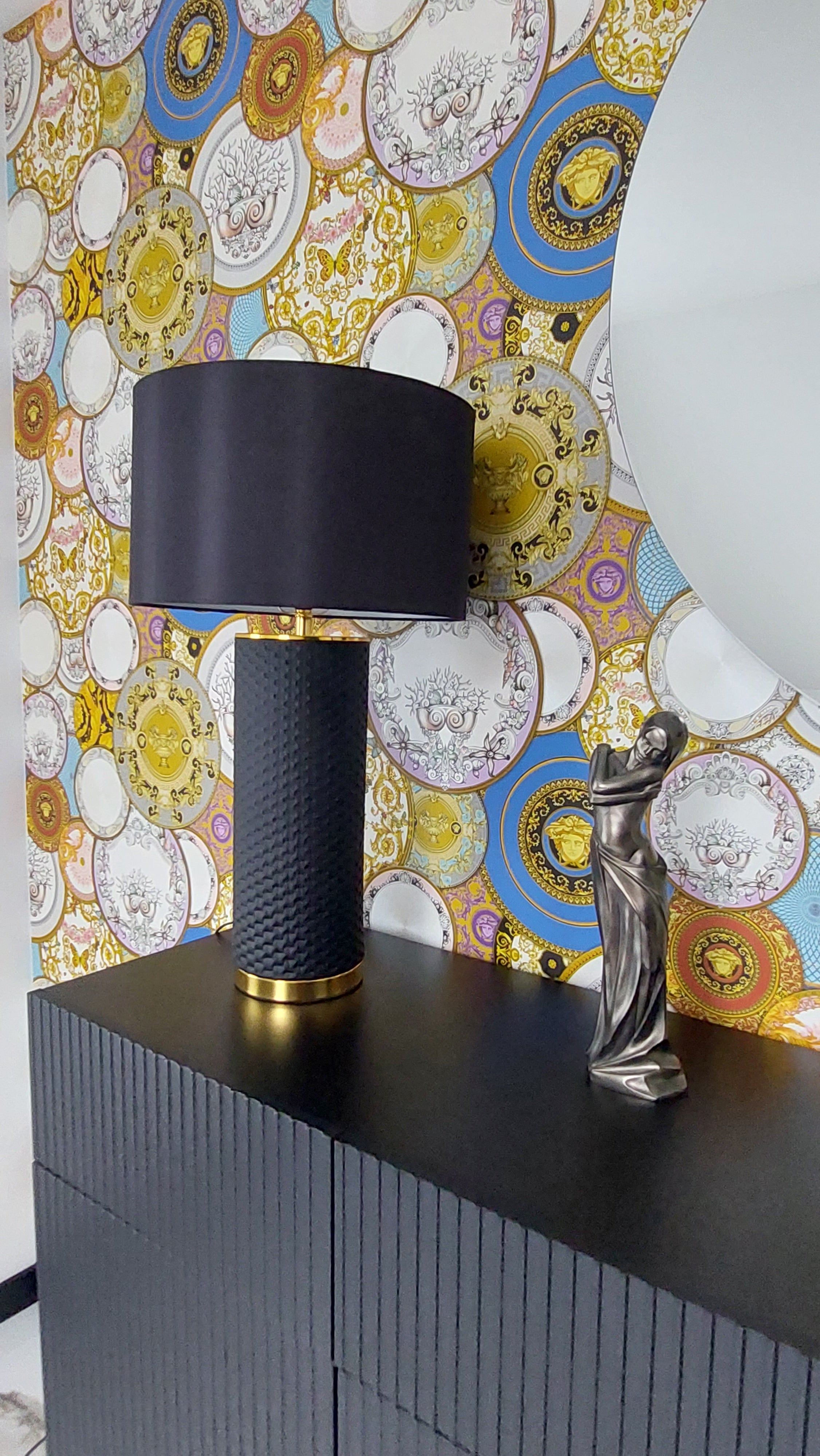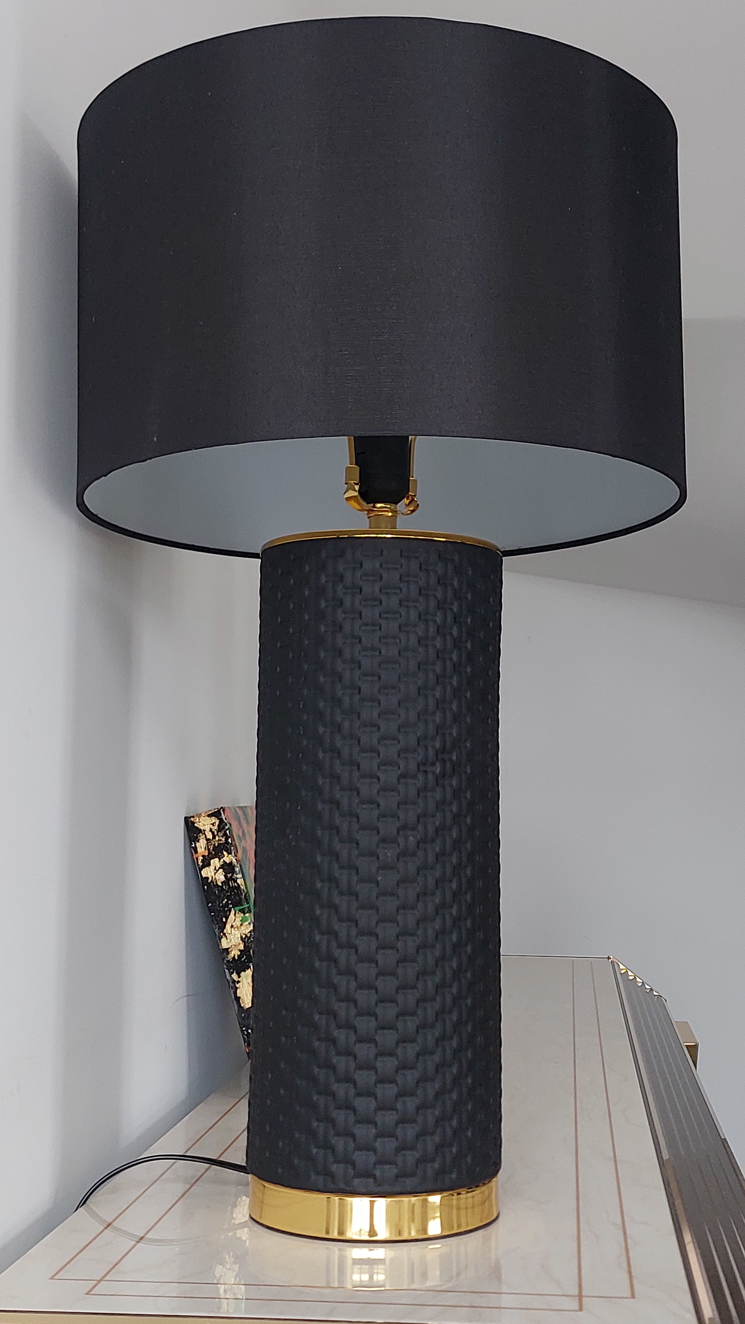 Piękna okazała lampa stołowa ELEGANCIA o eleganckim designie posiada okrągłą, artystycznie wypalaną ceramiczną podstawę w kolorze czarno-złotym o luksusowym wyglądzie, zapewniającą stabilność. Okrągły klosz z czarnego materiału rozprasza światło, tworząc przyjemną atmosferę – idealną na przytulne wieczory. Lampę można postawić na stolik pomocnicze, szafki nocne lub komody. Połączenie czerni i złota harmonijnie komponuje się z różnymi stylami wystroju wnętrz.