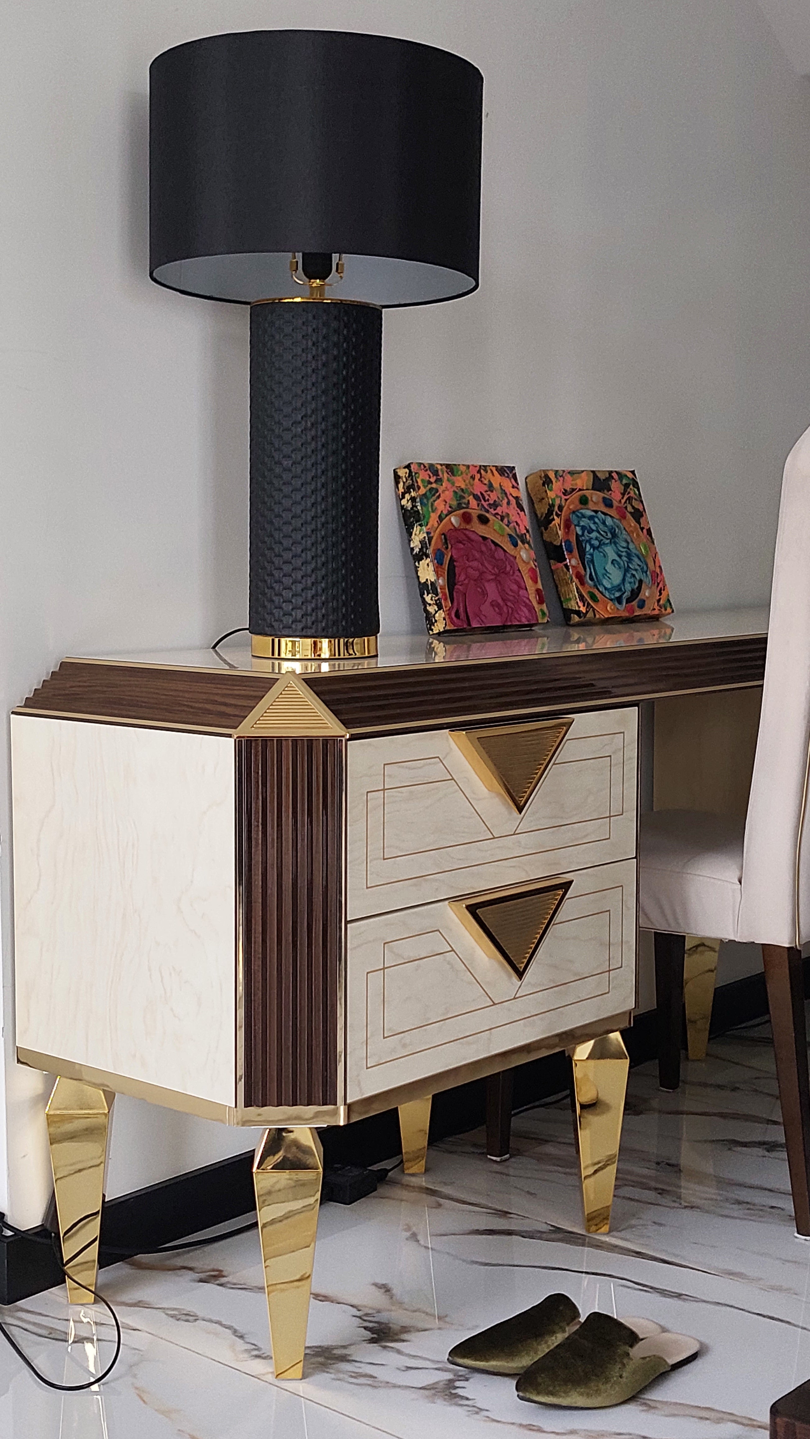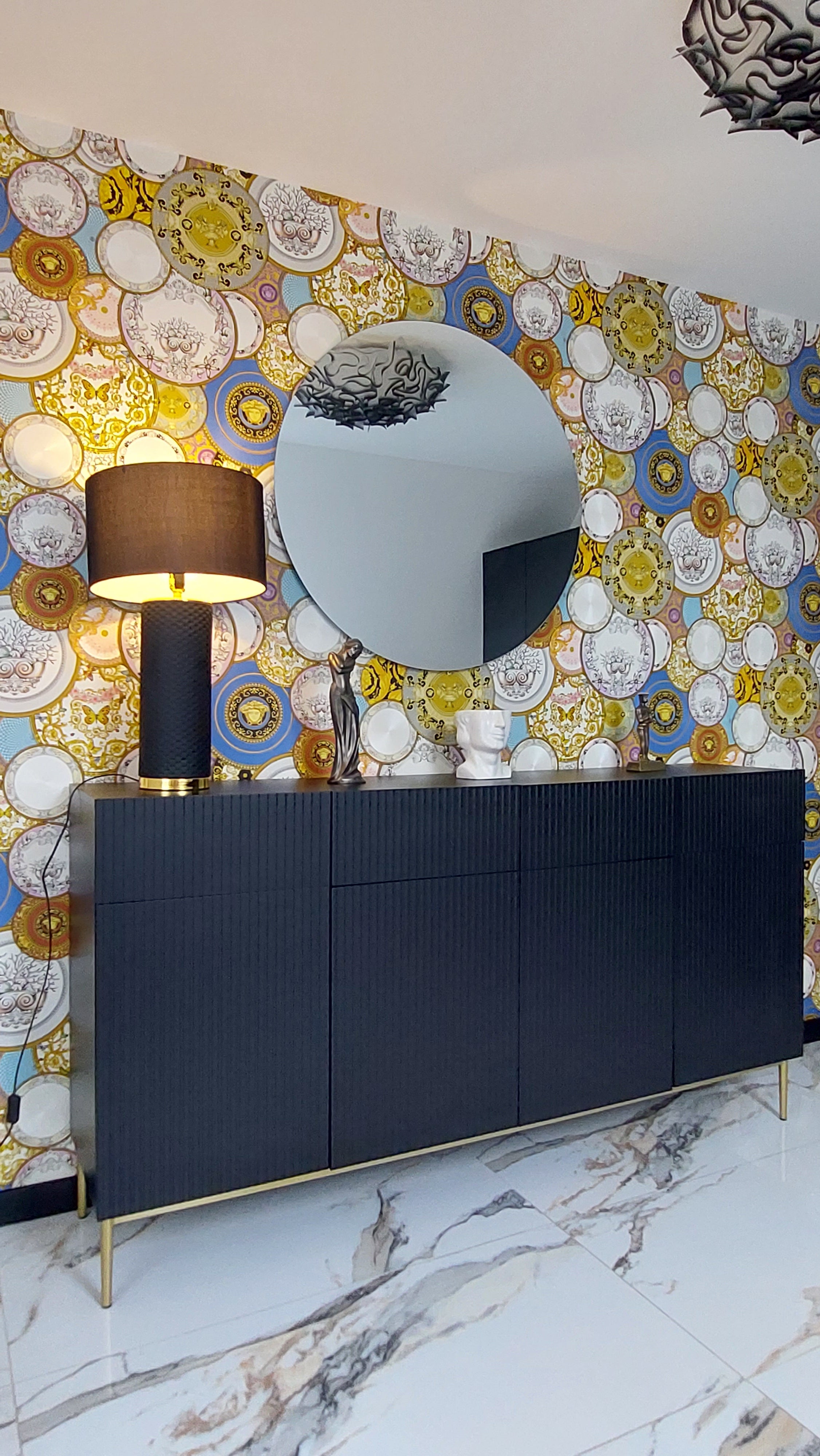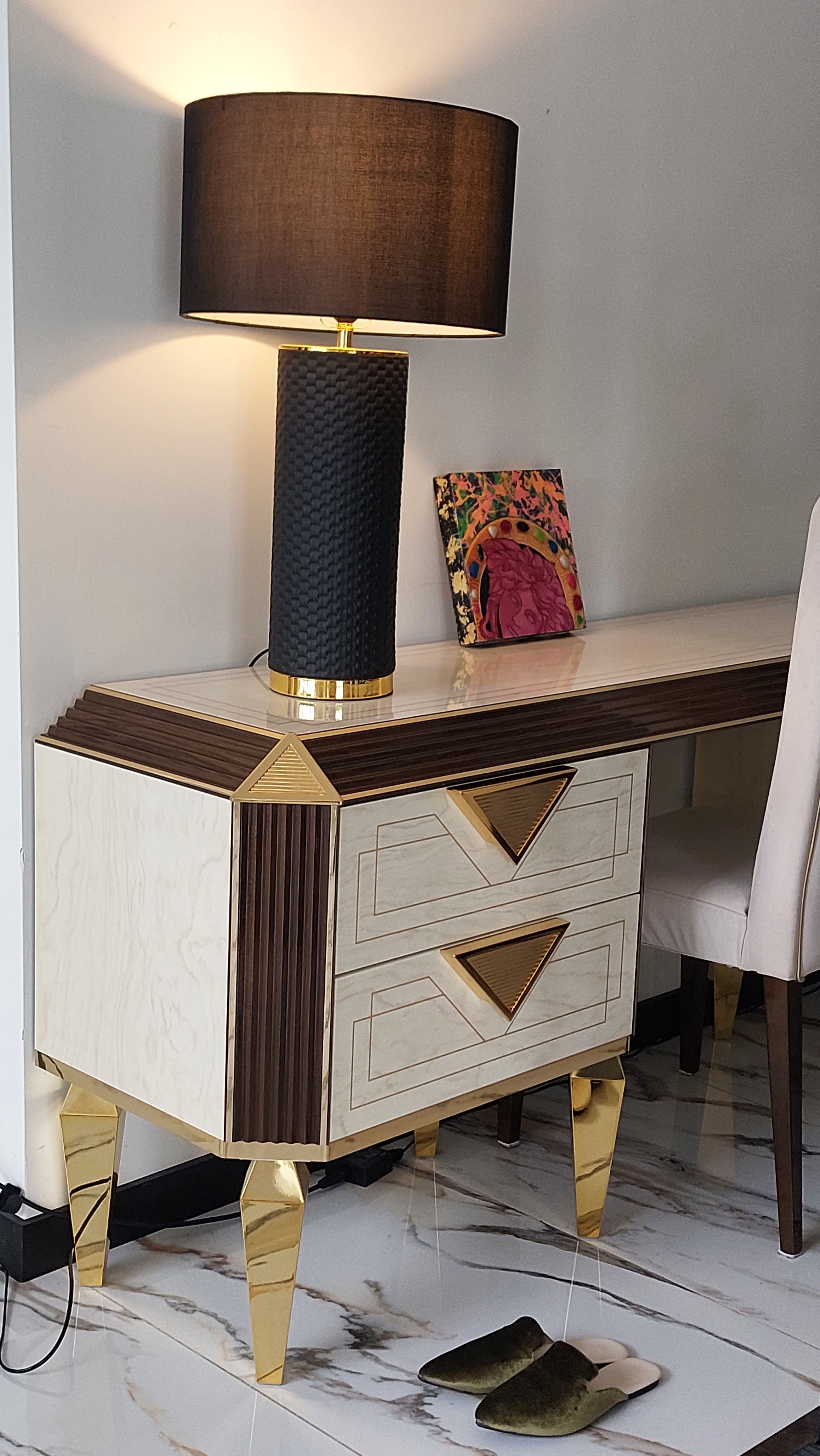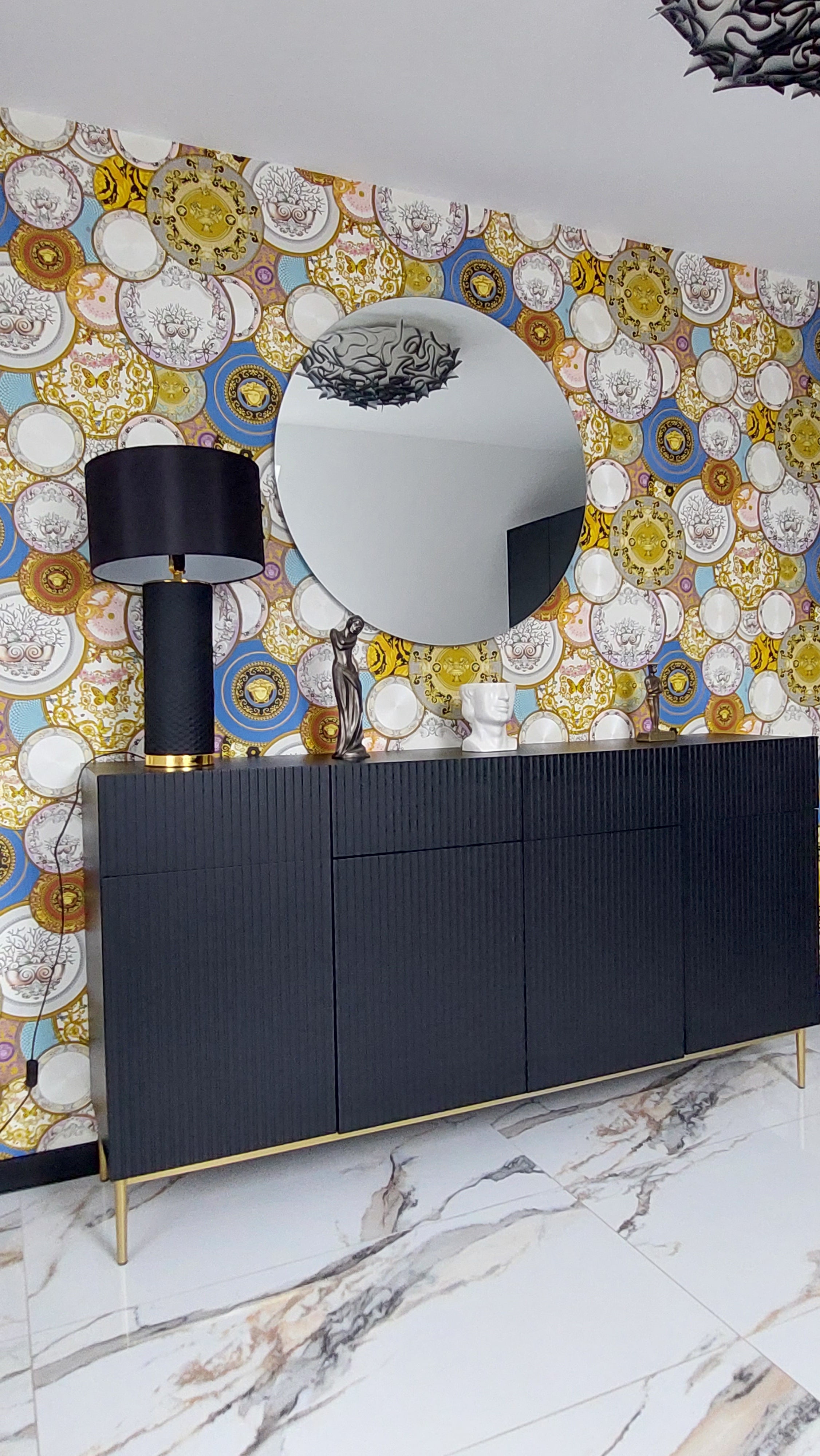 Piękna okazała lampa stołowa ELEGANCIA o eleganckim designie posiada okrągłą, artystycznie wypalaną ceramiczną podstawę w kolorze czarno-złotym o luksusowym wyglądzie, zapewniającą stabilność. Okrągły klosz z czarnego materiału rozprasza światło, tworząc przyjemną atmosferę – idealną na przytulne wieczory. Lampę można postawić na stolik pomocnicze, szafki nocne lub komody. Połączenie czerni i złota harmonijnie komponuje się z różnymi stylami wystroju wnętrz.