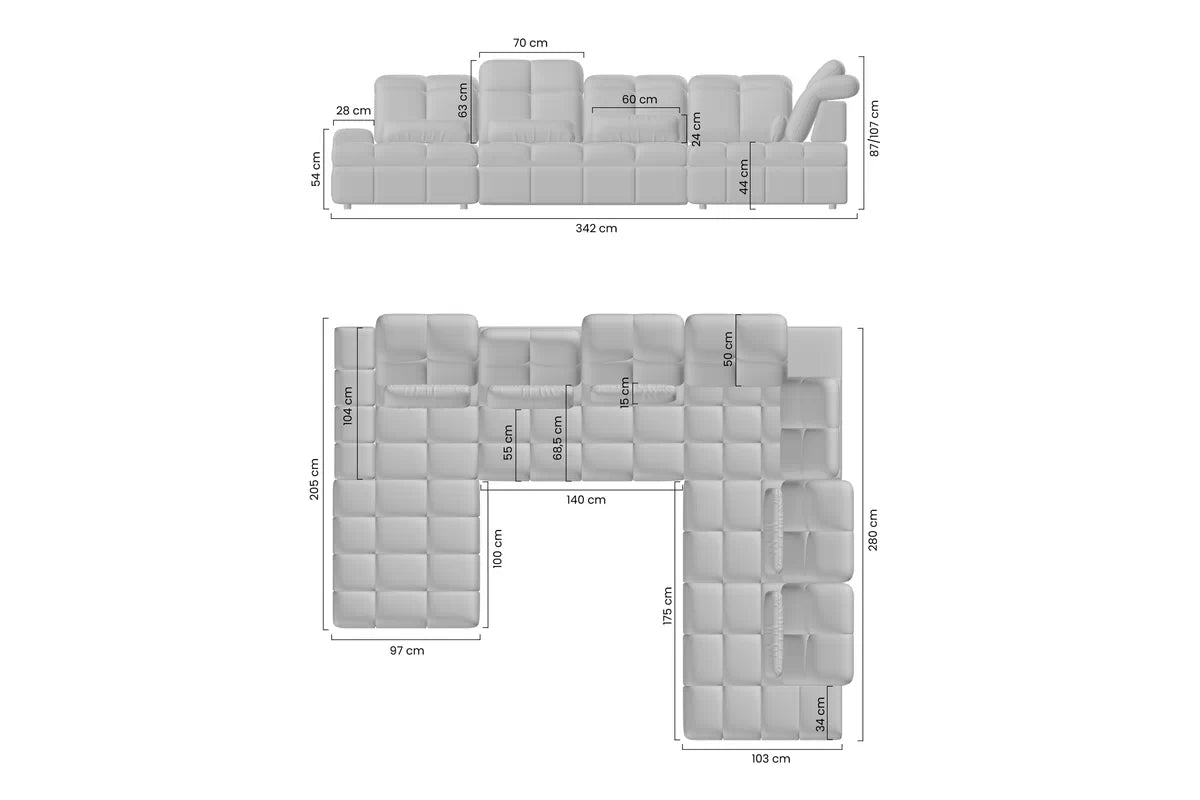 Wyposażony w mechanizm rozkładania typu Delfin oraz elektrycznie wysuwane siedzisko, narożnik łatwo przekształca się w przestronne łóżko. Dwa pojemniki na pościel o wymiarach 196/24/62 cm i 166/24/95 cm zapewniają praktyczne miejsce do przechowywania.