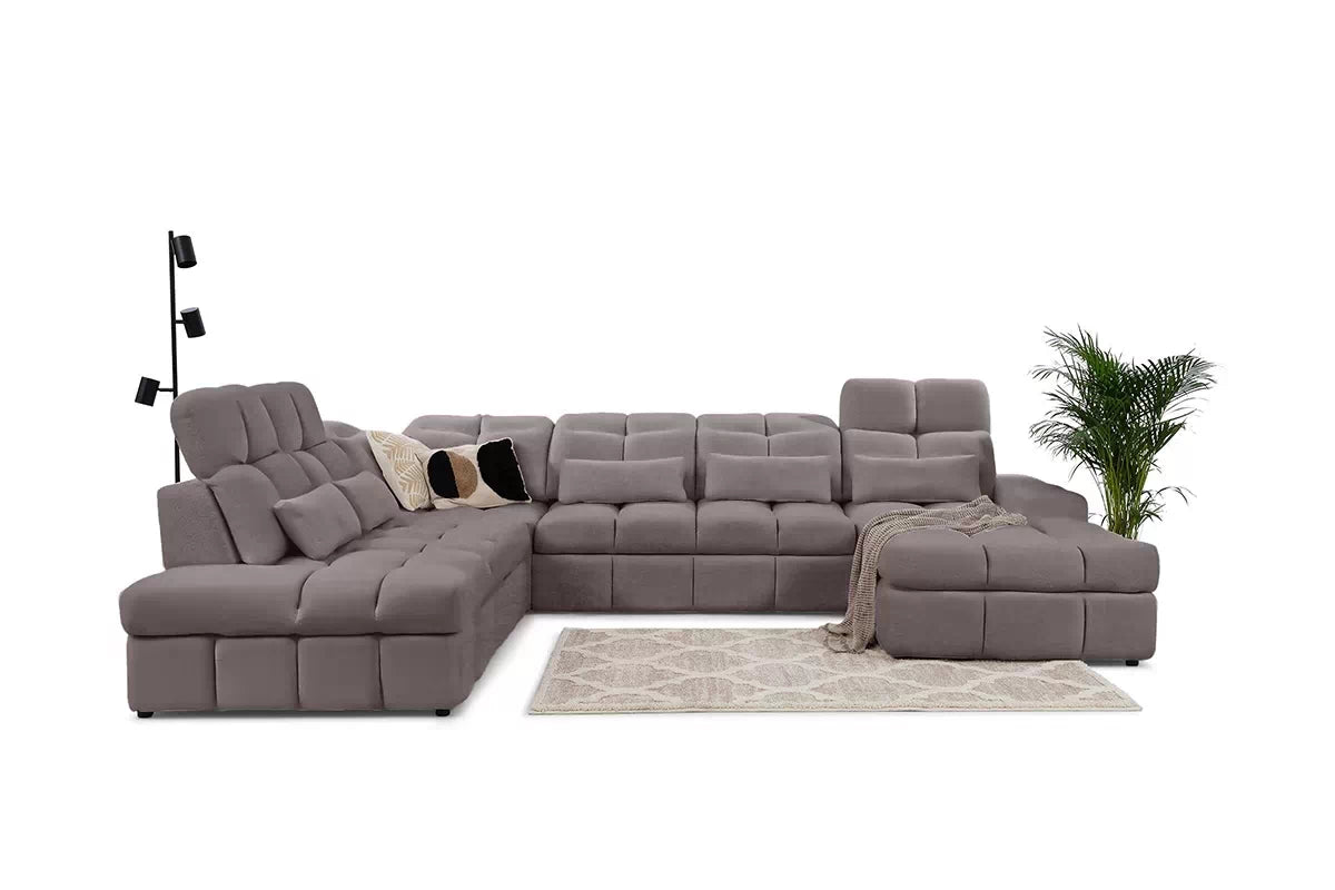 Nowoczesny narożnik w kształcie litery U, wykonany z wysokiej jakości materiału Vogue 9, to połączenie funkcjonalności, komfortu i stylowego designu. Dzięki swojej imponującej szerokości i dodatkowym funkcjom, jest idealnym rozwiązaniem dla przestronnych wnętrz.