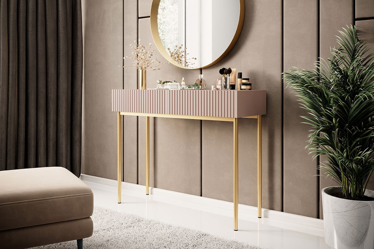 Nowoczesna konsola / toaletka z szufladami Nicole 100 cm - antyczny róż MDF / złote nóżki
