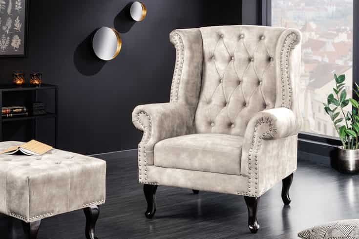 Elegancki podnóżek CHESTERFIELD w kolorze szampańskiego beżu to idealne uzupełnienie opisanego fotela – razem tworzą spójny, luksusowy zestaw wypoczynkowy. Miękkie aksamitne obicie pięknie odbija światło, a klasyczna forma z dekoracyjnymi detalami sprawia, że pufa/podnóżek staje się nie tylko praktyczny, ale i bardzo reprezentacyjny.