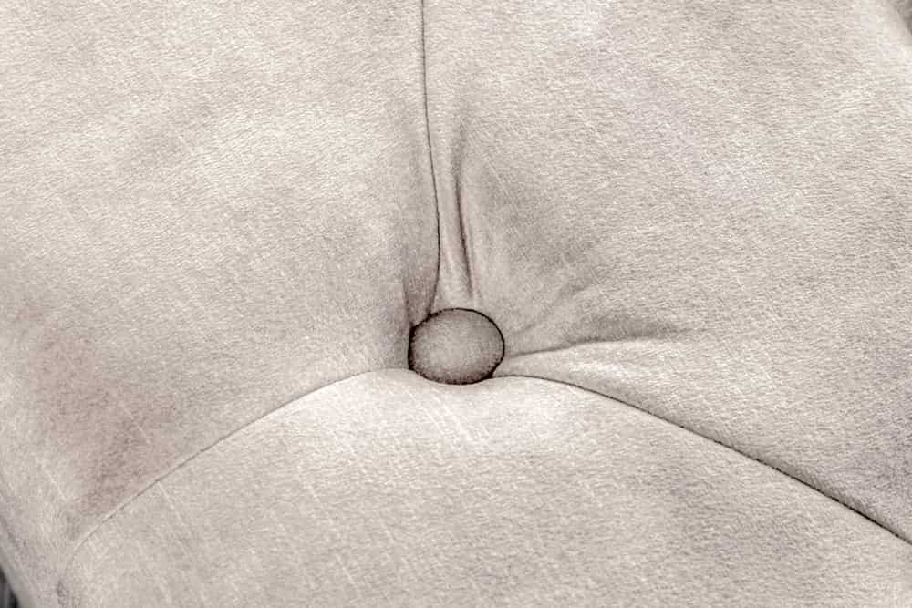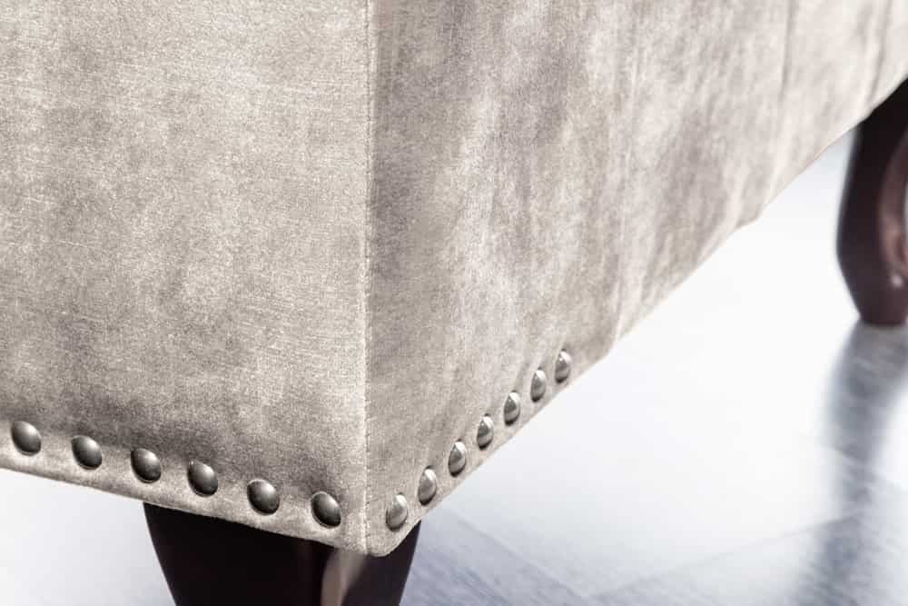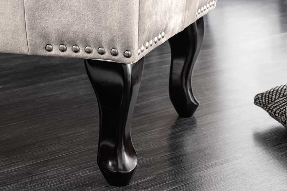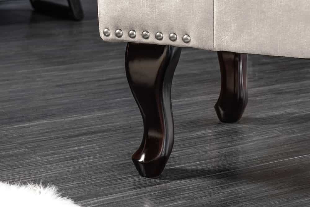 Zakrzywione drewniane nóżki w kolorze ciemnobrązowym nadają lekkości i podkreślają charakter stylu Chesterfield. Całość dopełniają ozdobne pikowania na blacie oraz srebrne nity, które tworzą efekt „biżuteryjnego” wykończenia.