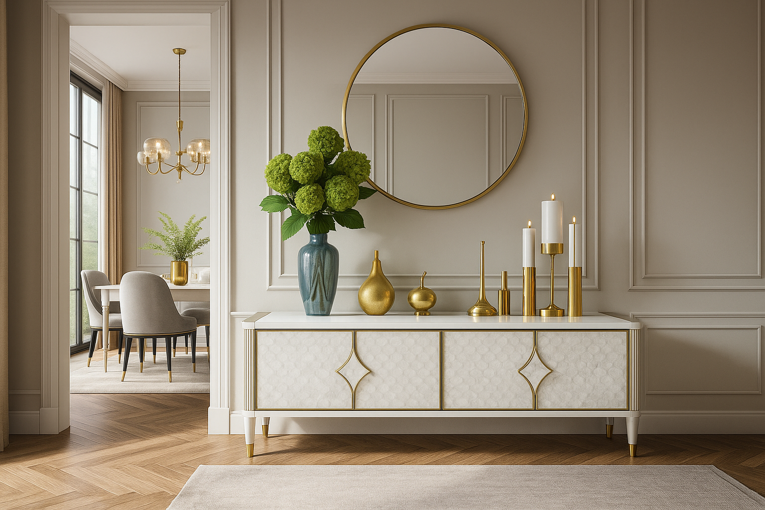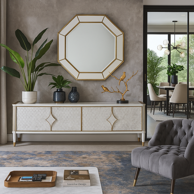Oryginalna komoda rtv w kolorze białym ecru z frontem wykonanym z naturalnej muszli układającej się na wzór rybich łusek. Drzwi okalają złote listwy a całości dopełniają masywne uchwyty w kształcie karo. Białe nóżki zakończone są złotym akcentem.