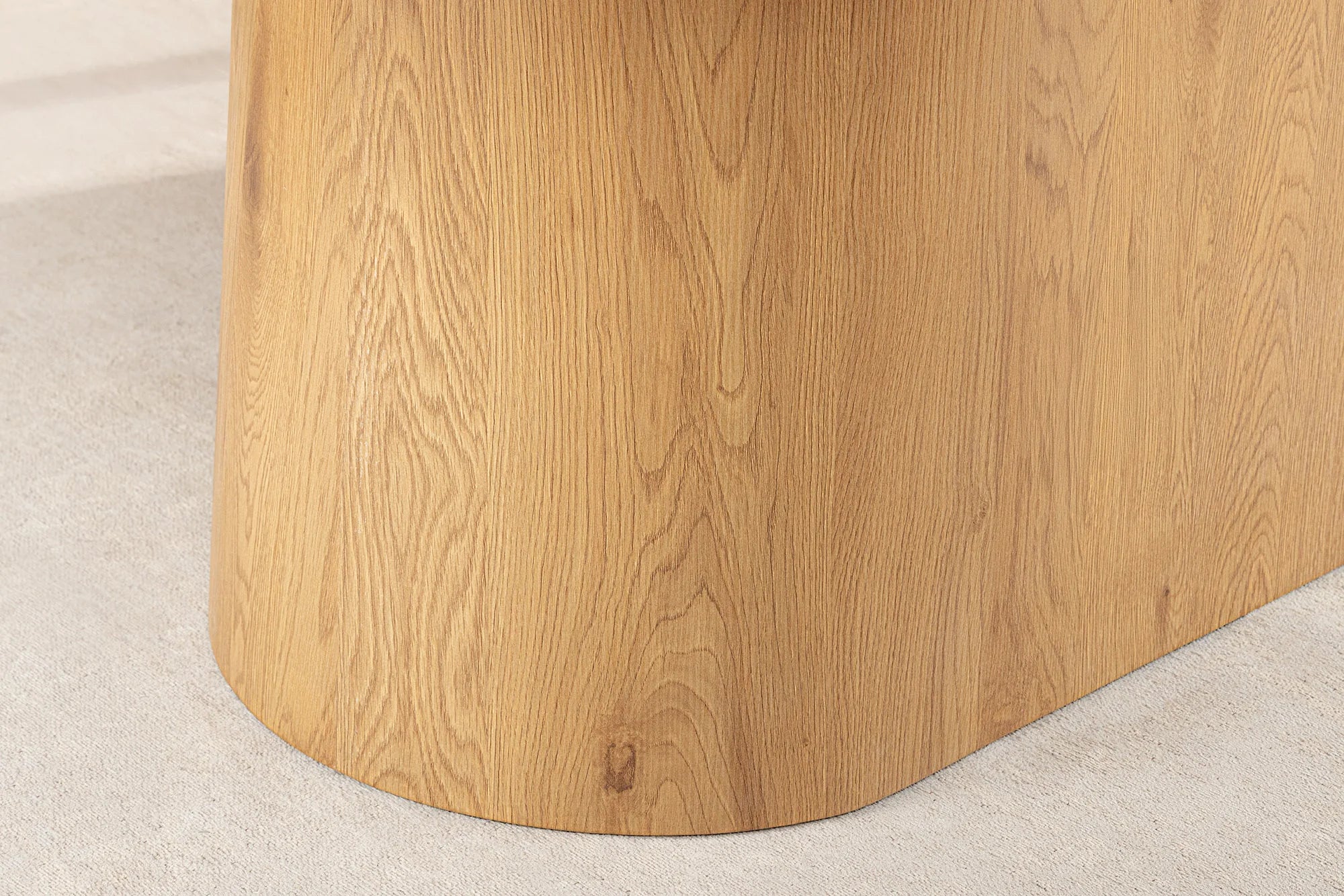 Rama i podstawa stołu wykonane zostały z MDF pokrytego naturalną okleiną dębową. Fornir ma piękne, wyraziste usłojenie i głęboki, ciepły odcień dębowy, który wnosi do wnętrza przytulność i elegancję. Stabilna, kolumnowa podstawa dodaje stołowi nowoczesnego sznytu, a jednocześnie zapewnia wygodę przy siedzeniu.