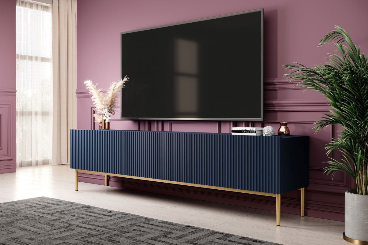Szafka RTV Nicole z szufladą na metalowych nogach 200 cm - granat / złote nóżki
