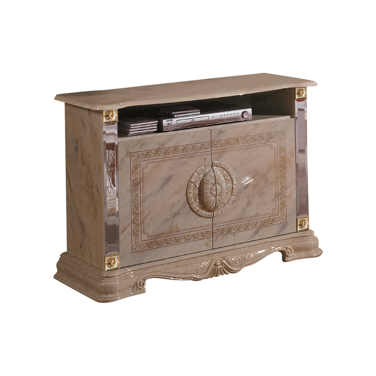Zachwyca swoim beżowym onyxowym kolorem w połysku, który pięknie odbija światło i rozjaśnia wnętrze. Złote zdobienia i delikatne rzeźbienia dodają jej klasy i sprawiają, że doskonale wpasuje się w salon urządzony w stylu glamour, klasycznym czy nawet pałacowym. Na froncie znajduje się charakterystyczna rozeta, a boki zdobią lustrzane wstawki, które nadają meblowi lekkości.