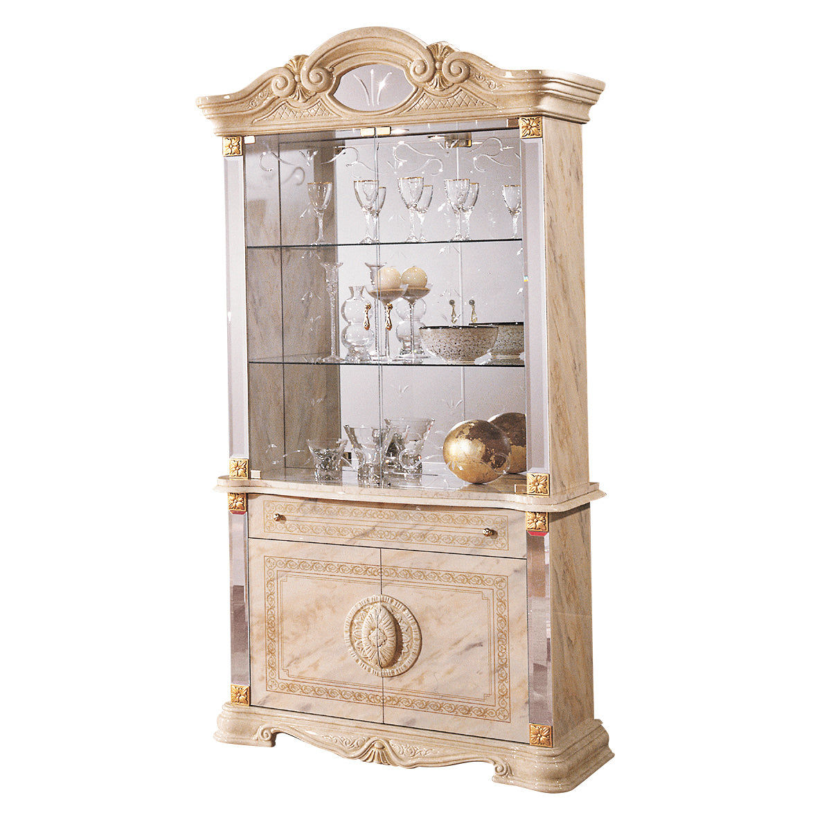 Witryna zachwyca eleganckim beżowym onyksowym kolorem wykończonym na wysoki połysk. Złote zdobienia subtelnie podkreślają klasyczny styl i dodają wnętrzu blasku.