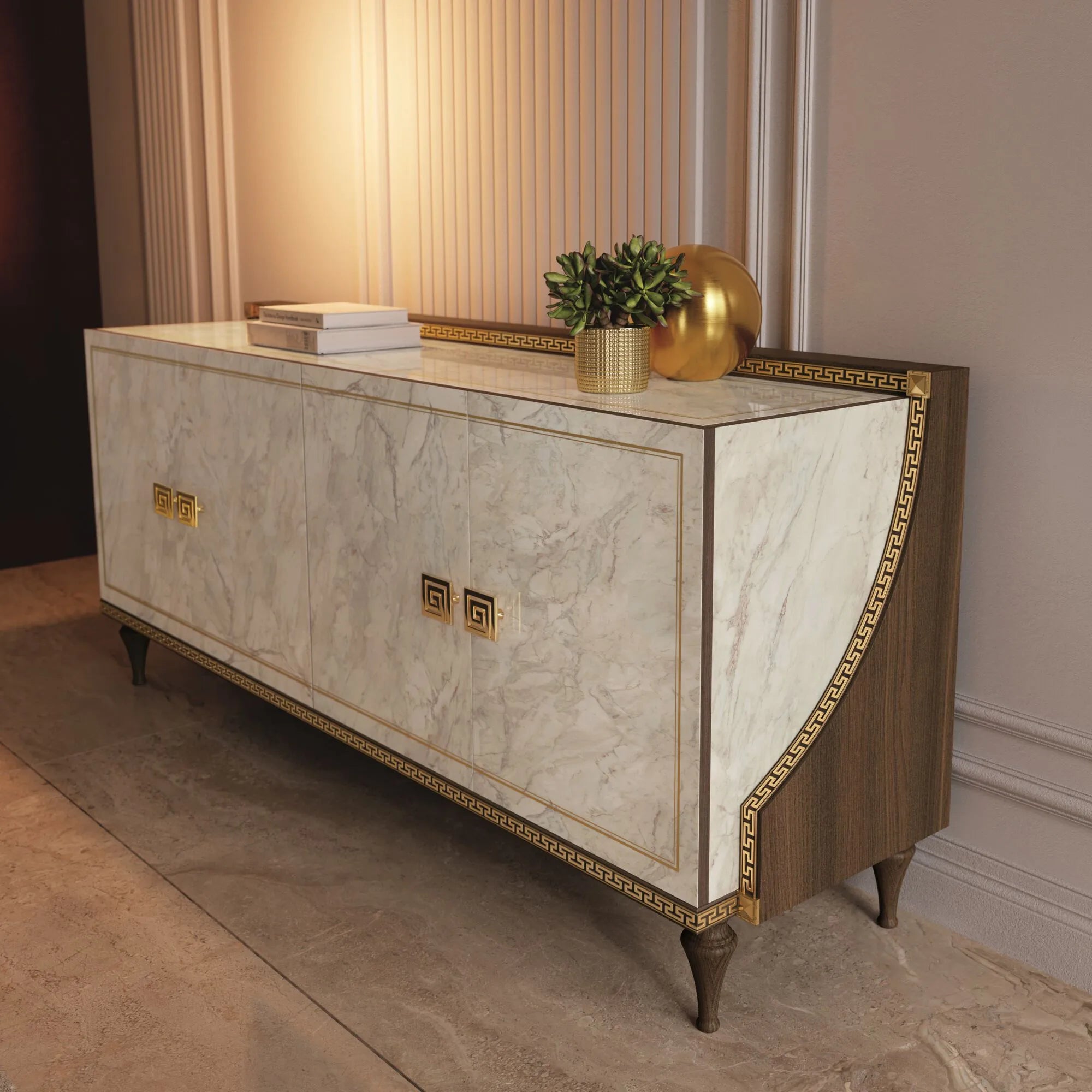 Fronty komody zdobi imitacja marmuru Carrara z delikatnym żyłkowaniem, ujęta w subtelną ramę o złotych akcentach i klasycznym motywie greckiego meandra. Ciepły ton bocznych elementów w optyce orzecha nadaje całości wyjątkowej głębi i elegancji. Pozłacane uchwyty w formie geometrycznych ornamentów oraz smukłe, toczone nóżki podkreślają lekkość formy i włoską finezję wykonania.