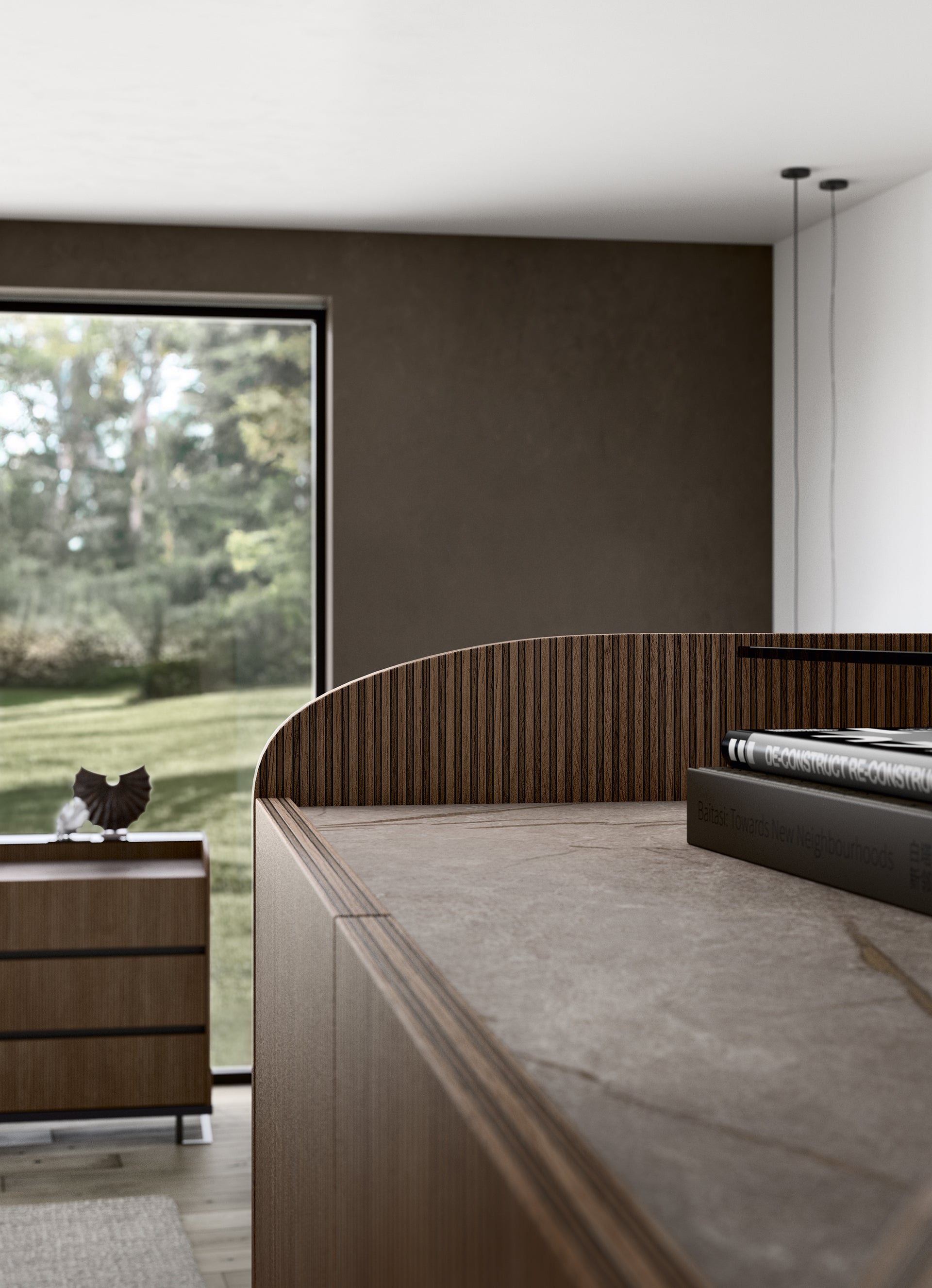 Szafka nocna HEXAGON to esencja włoskiego designu – harmonijne połączenie funkcjonalności, elegancji i nowoczesnych detali. Jej unikalna forma z zaokrąglonymi krawędziami i pionowym ryflowaniem frontu nadaje wnętrzu wyjątkowy charakter. Korpus wykonany został z wysokogatunkowej płyty meblowej pokrytej fornirem o wyraźnej strukturze drewna, co podkreśla naturalne piękno materiału. Stabilna metalowa podstawa w kolorze czarnym dodaje lekkości i industrialnego wdzięku.